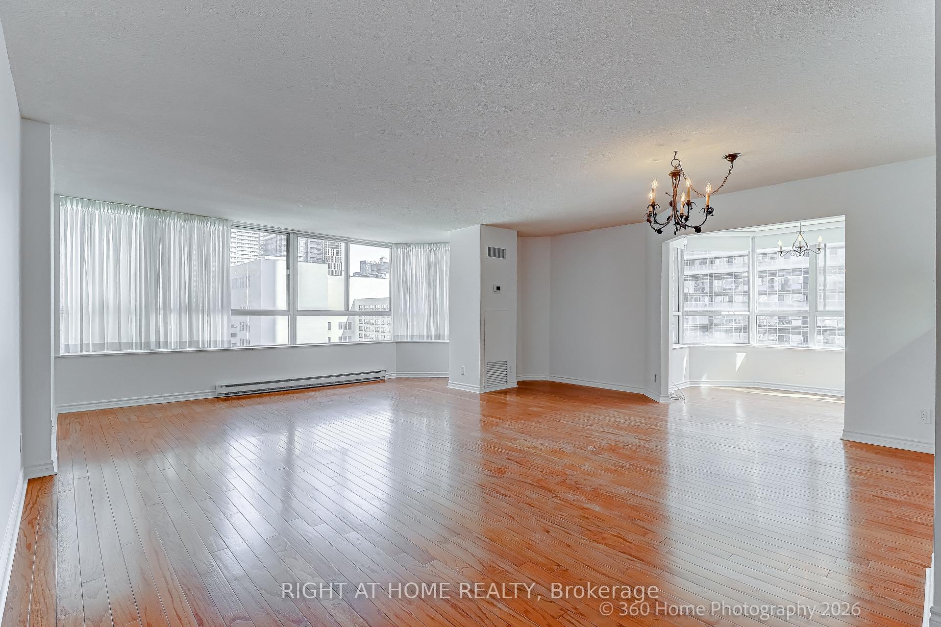 Sun-filled, spacious, and beautifully maintained condo in a prime downtown location. This rarely available 1,464 sq ft unit with quiet northern exposure offers unobstructed views of College Park, 3-acre green space featuring the Barbara Ann Scott Ice Skating Trail , fountain and a children's playground. The large open-concept kitchen, dining, and living area flows seamlessly into two generous solariums - perfect for a home office, breakfast nook, or cozy den. The primary bedroom includes a walk-in closet and a 5-piece ensuite, while the second bedroom also features a walk-in closet and easy access to a 4-piece bath with ensuite laundry. Updated kitchen and bathrooms, fresh paint throughout, newly refinished floors and new blinds. One parking spot, one locker and heat, hydro, water, building insurance and even internet and Cable TV are included in the rent. Make sure you visit the second floor and excellent building amenities, including exercise room, indoor pool, sauna, hot tub, party room and running track. Property Management office in the building. 24-hour security. This is a non-smoking building with no short-term rentals allowed, offering a quiet and well-managed living environment. Close to UofT, UHN teaching hospitals, TMU, Financial District, steps to transportation and walking distance to all the amenities and entertainment.
