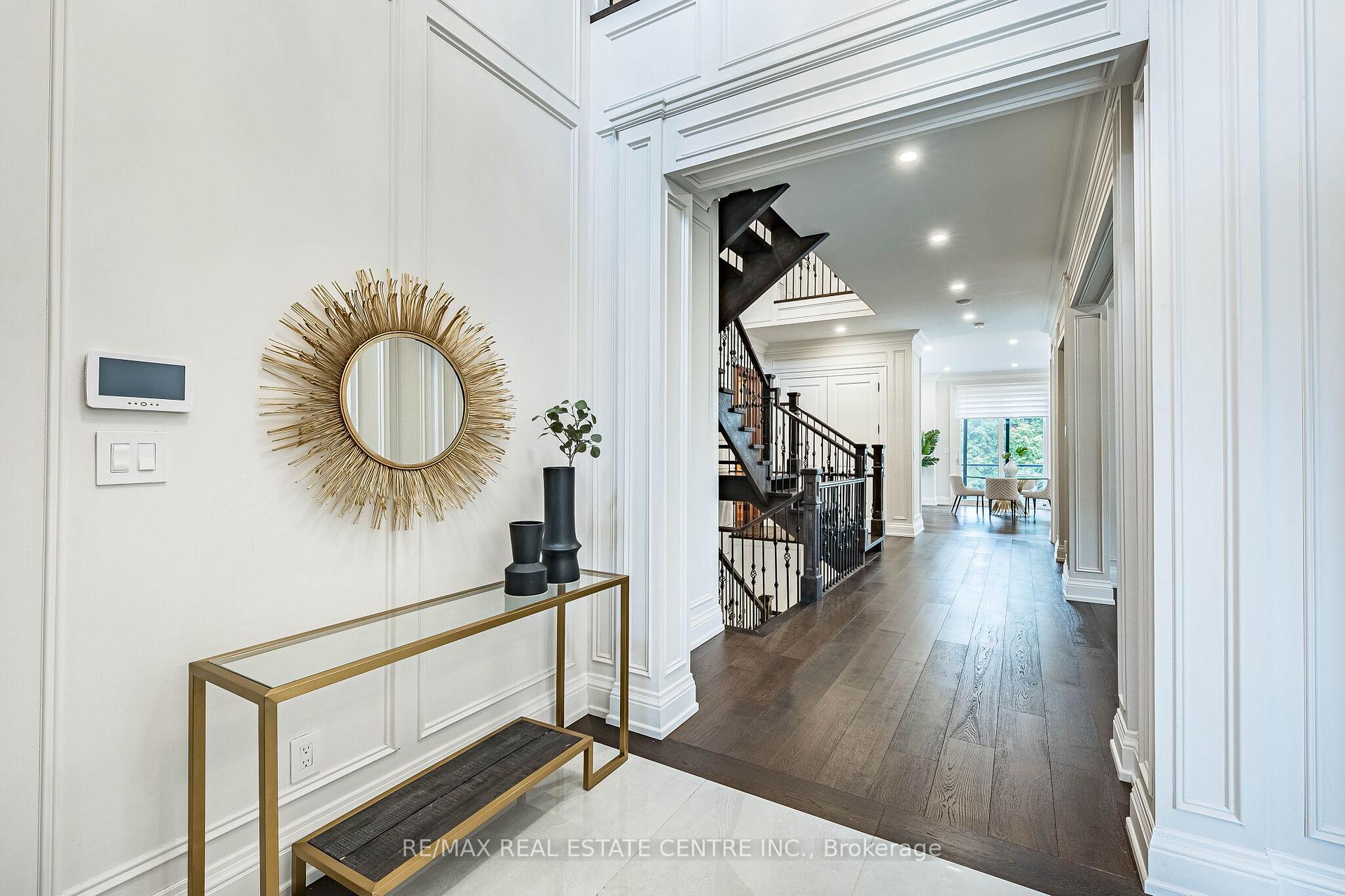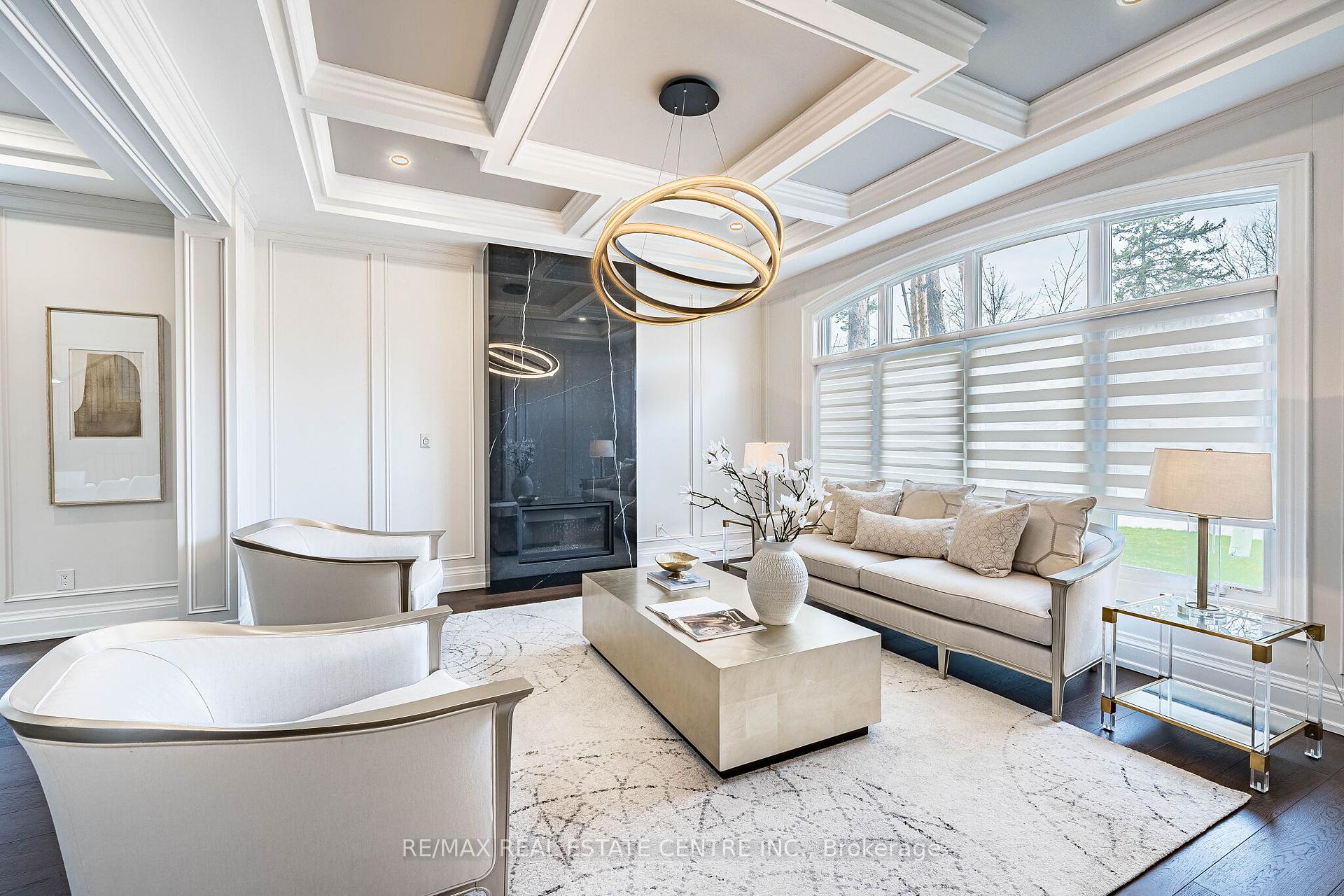 An Exceptional Custom-Built Masterpiece in Prestigious Newtonbrook East. Welcome to this remarkable custom-built (2022) residence set on a rare irregular lot with 65 ft frontage expanding to 124 ft deep. Offering approx. 7,000 sq. ft. of total living space, this home blends timeless elegance with modern luxury. A striking Indiana stone façade, grand precast entrance, and custom double doors create a commanding presence, complemented by a double-car garage and an extended driveway accommodating up to 6 vehicles. Inside, a breathtaking 20-ft foyer and soaring 10-ft ceilings on the main and second floors (9-ft in basement) create a grand, airy atmosphere. An in-home elevator provides seamless access to all levels, enhancing both convenience and long-term comfort. Exquisite craftsmanship is showcased throughout with full panelled walls, extensive wainscoting, and detailed trim work. The main floor offers a refined walnut-paneled library-ideal for a private office or study. This home is equipped with a fully integrated Control4 smart home system featuring an 8-zone audio amplifier, allowing effortless control of lighting, climate, alarm, audio, garage doors, and smart locks directly from your phone or tablet. The chef-inspired kitchen boasts premium custom cabinetry, a separate pantry, and elegant Calacatta quartz countertops and backsplash, complemented by top-of-the-line Sub-Zero and Miele appliances. The space flows seamlessly into expansive living and family areas with designer fireplaces and custom wall units-perfect for both everyday living and entertaining. Oversized rear doors open to a spacious deck, creating a seamless indoor-outdoor experience. Upstairs, the primary suite offers a luxurious retreat with a custom makeup station and an expansive walk-in dressing room with built-ins. The spa-inspired ensuite features heated flooring and high-end finishes, while all additional bedrooms include their own ensuite bathrooms and ample closet space