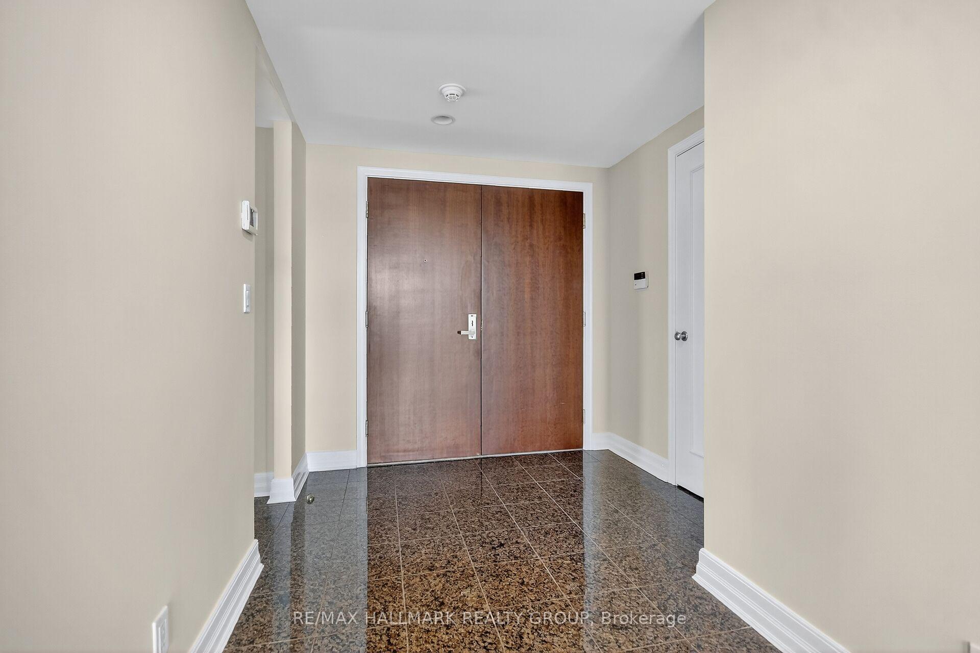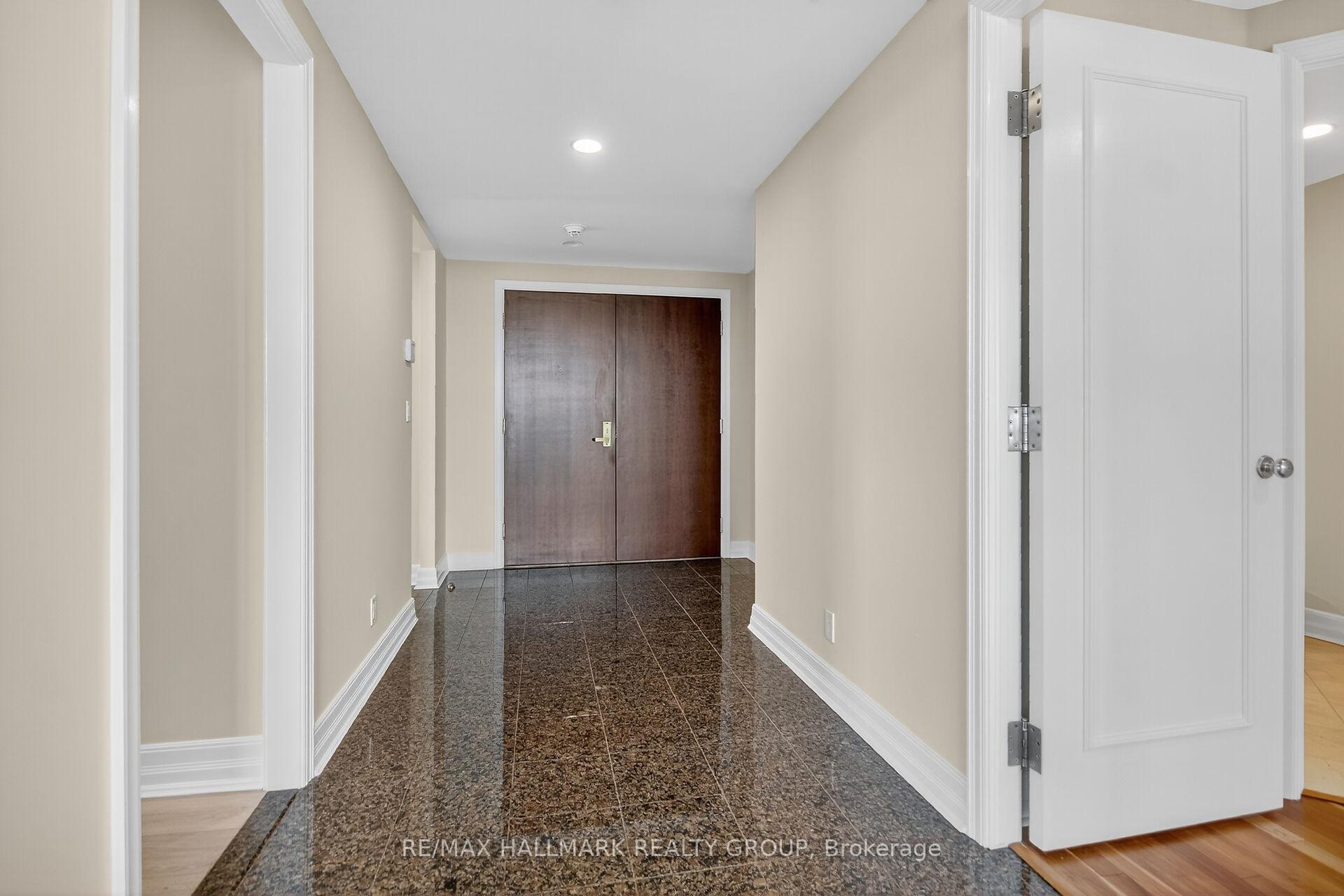 Welcome to an extraordinary resort style setting along the picturesque Rideau River in one of Ottawa's most prestigious gated communities. This impressive 1836 square foot corner residence offers two bedrooms plus a spacious den and two and half bathrooms. Fabulous open concept living and dining rooms and adjacent study with expansive wall to wall windows showcasing amazing cityscape views. Beautifully renovated chef's kitchen featuring expanded cabinetry, quartz countertops, ceramic backsplash, built in wine fridge and bright eat in area with access to a spacious glass enclosed balcony. Primary bedroom suite includes a walk in closet with built in custom cabinets and a spa inspired ensuite with walk in shower and a deep soaker tub. The spacious second bedroom is thoughtfully positioned on the opposite side of the apartment and is complete with its own private ensuite bathroom. Breathtaking panoramic views from every room with amazing RIVER VIEWS from the kitchen, second bedroom and balcony. High ceilings and rich hardwood flooring enhance the sophisticated appeal throughout. Amenities include indoor pool, tennis courts, pickle ball courts, exercise center, guest suites, concierge services and 24/7 gate house security. Underground parking and two storage lockers.