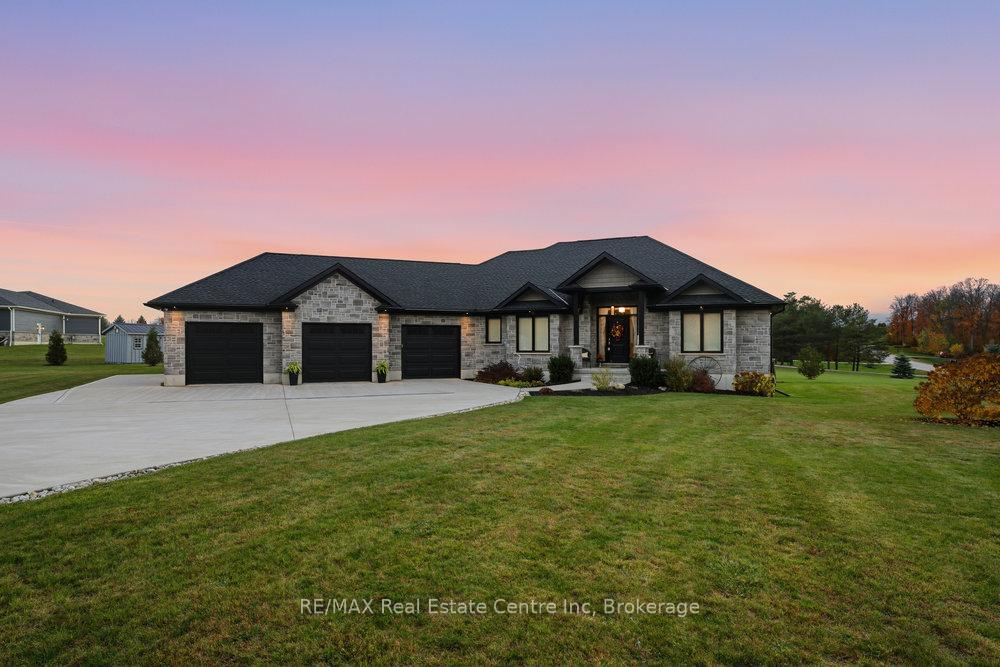 Welcome to this exceptional bungalow, perfectly situated on a spacious lot offering privacy, style, and room to entertain. The property features an impressive 4-car garage and a driveway that accommodates 12+ vehicles -perfect for gatherings or hobby enthusiasts. Step inside to an open-concept main floor filled with natural light and modern finishes. The bright, upgraded kitchen is a chef's dream, featuring a double-door pantry, Italian pot filler, and under-island garbage bins -beautifully blending function and design. The mudroom offers custom cabinetry and convenient direct garage access. The primary bedroom is a true retreat, showcasing a coffered ceiling, custom reading lights, and a luxurious 5-piece ensuite with a walk-in shower and free-standing tub. The second bedroom is currently used as a home office, offering flexibility for your lifestyle. A finished basement provides plenty of additional living space, including two additional spacious bedrooms, a home gym complete with sauna, and a 4-piece bathroom-ideal for guests or family. Step outside to your own private oasis: a covered lanai, on-ground pool, and hot tub create the perfect setting for relaxation and entertaining - all fenced and landscaped to provide the ultimate in privacy. This property truly offers the best of country living with refined style and comfort -an exceptional opportunity in beautiful West Grey.